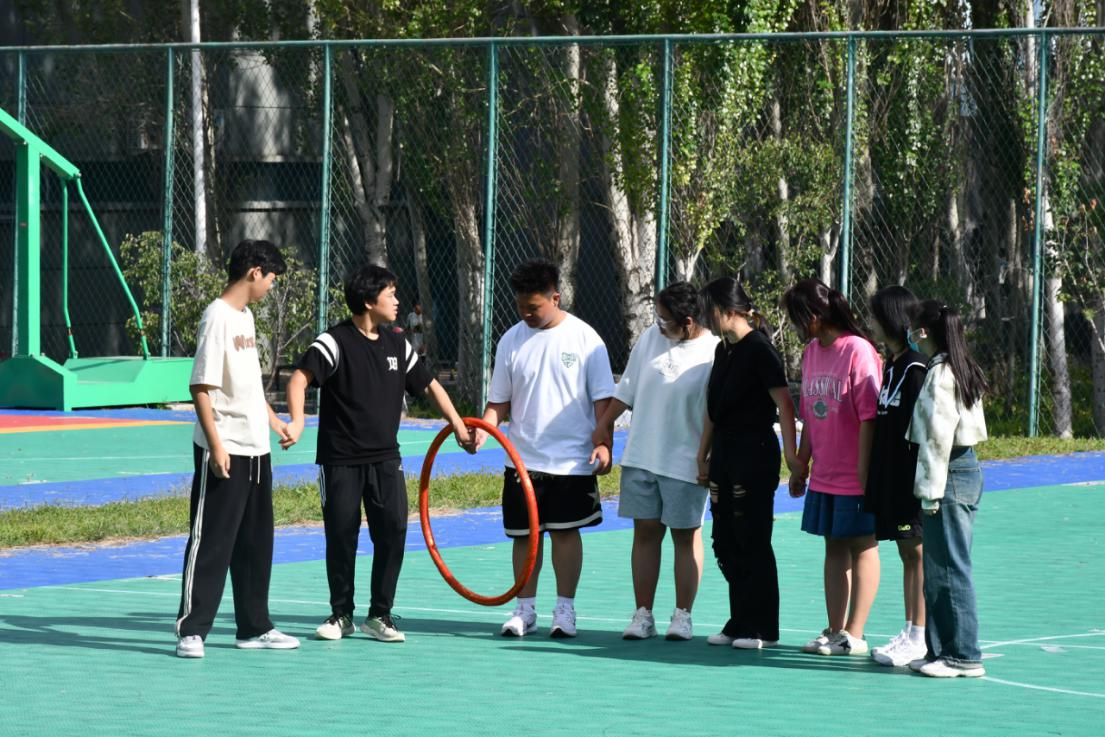 接下来进行的项目是“一圈到底”。这项活动需要大家手拉手排成一排,参赛选手们通过自身摆动使呼啦圈依次穿过自己的身体,用时最短的队伍将获得最后的胜利。各班代表队派出的参赛选手们兴致勃勃,积极尝试,一开始总是不得要领,屡屡失败,但是同学们并不气馁,选手们一次次的探索、彼此间一句句的鼓励,都成为最终获得成功的基石。同学们在场地上你争我赶、说说笑笑,青春欢快的笑声飘荡在场地上空。