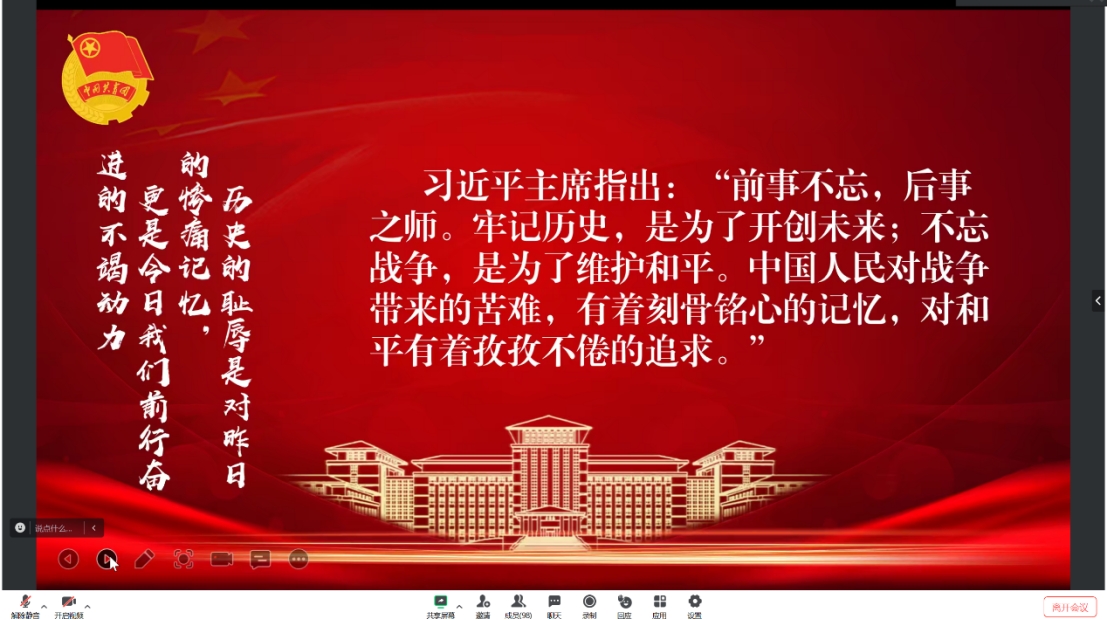 在活动中,陈婧书同学通过讲解与播放相关视频资料带领师生们回顾了“九·一八”历史事件的全貌。1931年9月18日,日本关东军炸毁沈阳南满铁路反诬陷中国军队所为,随即炮轰中国军队,进而攻击沈阳城,蓄意制造并发动震惊中外的“九一八事变”,一段中华民族苦难史就此拉开序幕。面对日本侵略者,面对民族的生死存亡,中国共产党人高擎抗日民族统一战线旗帜,带领中华民族用生命和鲜血谱写了抵御外敌入侵、争取民族解放的壮丽篇章。
