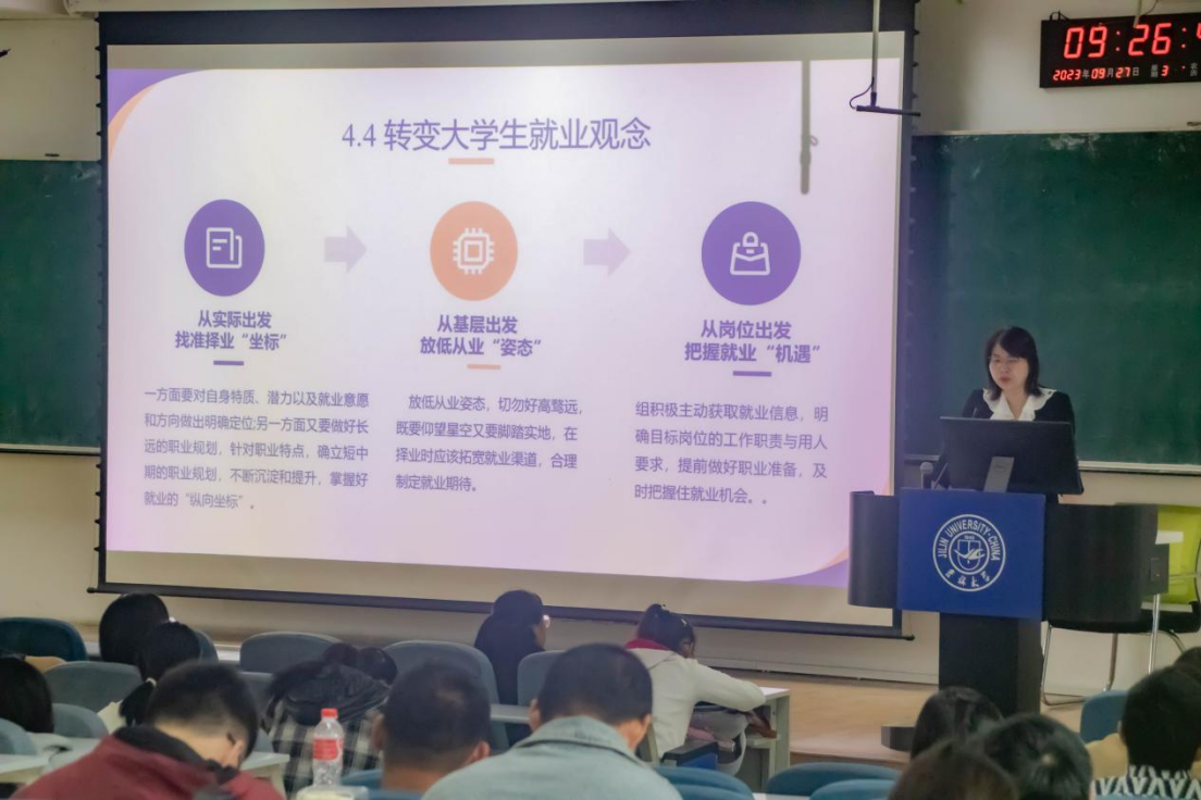 首先,冯老师结合近年来毕业生整体就业形势向同学们进行细致分析。冯老师提到,伴随经济走势和市场供需变化,老员工就业择业过程中面临巨大压力,职能性岗位竞争激烈和技术性岗位需求紧俏成为目前就业市场的主要态势。在此基础上,冯老师向同学们介绍了新型产业和事业单位在老员工就业选择中的优势地位。