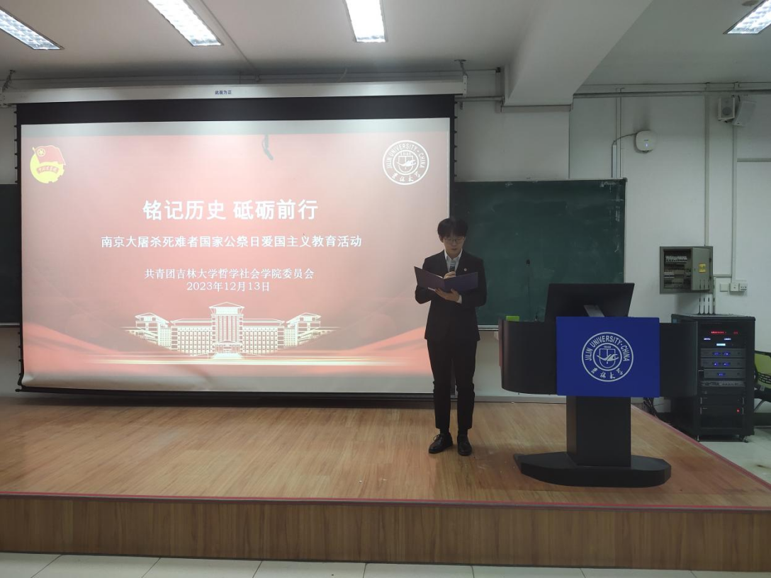 在此南京大屠杀惨案发生86周年之际,为缅怀先人,激励公司学子铭记历史、珍视和平,弘扬爱国主义精神,不忘初心、砥砺使命、淬炼品格、厚植情怀,太阳成集团tyc122cc团委组织南京大屠杀死难者国家公祭日爱国主义教育活动,活动由公司2022级本科生张惠侠同学主持。