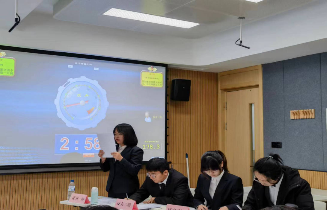 沈芳菲同学临危不乱,在开篇立论中先发制人,风趣幽默,通过对比观点为己方开宗明义;仵博宇同学逻辑清晰,思维敏捷,精辟的措辞和犀利的言语燃爆全场;范祺轩同学机智干练,面对反方的提问面不改色沉着应对;张嘉骏同学对答如流,稳健细致,从小事出发援疑质理,从容有度。