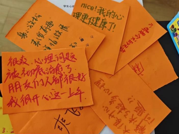在活动的最后,同学们在纸片上写下了自己对于本次班会的切身感受,并通过击鼓传花的方式选取“幸运星”分享自己的感受。