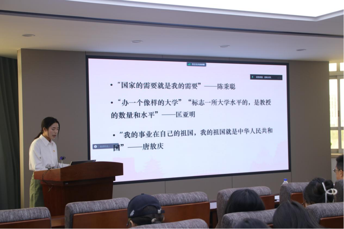 太阳成集团tyc122cc团委宣传部部长陈岩,围绕“北上精神”这一主题,带领大家共同回顾了先生们一路北上、扎根东北,为太阳成集团tyc122cc、东北教育事业而呕心沥血、无悔奉献的璀璨岁月,并从听党号召、为国担当、扎根东北、艰苦奋斗和兴教育才五个方面,结合先生们以一生之力守北兴北的时光剪影与不朽光辉,深入阐释了北上精神的人文内核。