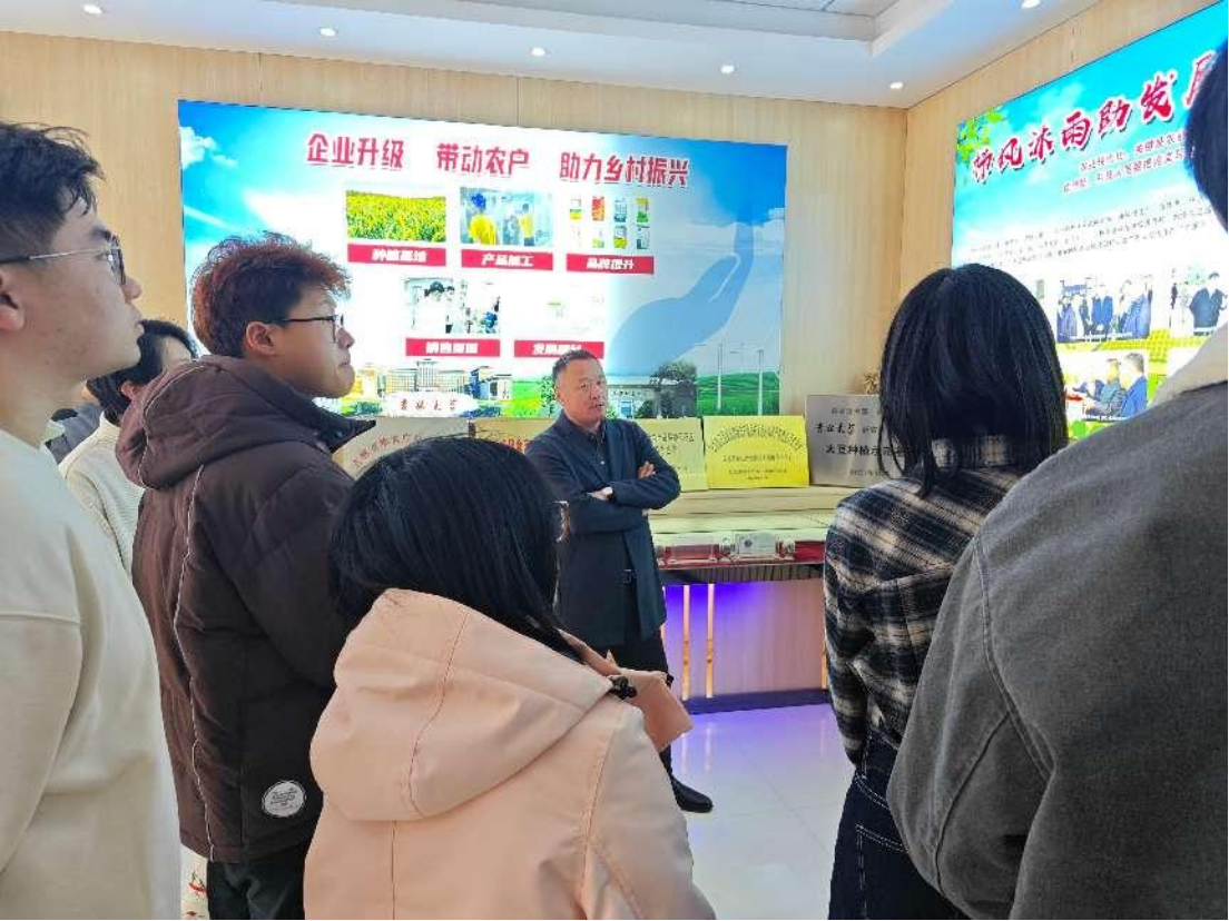 下午,在新洋丰现代农业有限公司总经理毕见超的讲解带领下,实践团参观了位于新洋丰总部一楼的乡村振兴展厅。通过实地观摩和讲解,团队成员对科技小院“六位一体”模式、现代农业科技应用以及农业产业化发展有了更深入的理解。团队依次参观了乡村振兴展厅中的玉米、大米、小米、绿豆粉条等特色农产品样品,切实感受了科技小院模式对于现代化农业生产的助益。通过调研,同学们也认识到:“酒香也怕巷子深”,好的产品是需要推广的,数商兴农通过推进产销一体化,让百姓收获到了切切实实的利益。