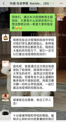 18级社工班由团支书崔荣敏同学提醒同学们要注意做好防护,积极配合防疫人员的各项工作安排,切实加强自身思想道德修养,及时观看青年大学习;然后,班长宋绍伟同学就公司相关防疫政策向同学们进行了解释,并提醒同学们要及时关注权威信息发布,坚决做到“不信谣、不传谣”,在疫情防控期间遇到困难一定要及时向老师们反映,科学防疫、合理求助;最后,学委张若晗同学向大家解释了有关毕业季教务方面的问题,并督促大家认真完成毕业论文的写作。