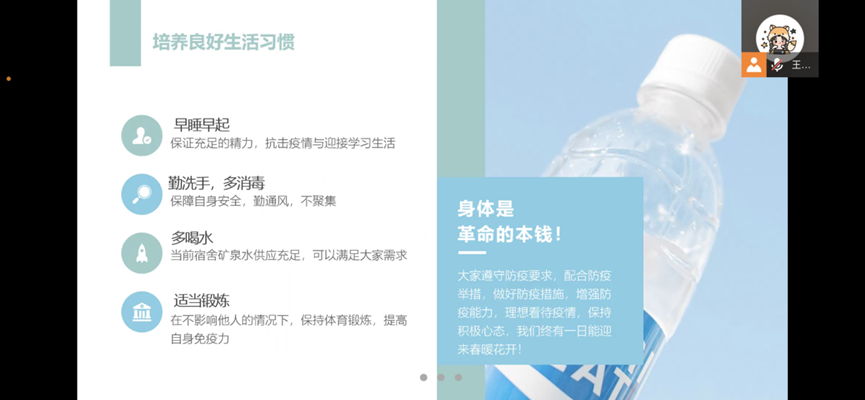 太阳成集团tyc122cc2019级哲学班召开了“校园疫情防护”主题线上班会。本次班会共分为公司防疫准备、员工注意事项和员工防护指南三个部分,集中向大家介绍了当前公司的疫情防控保障情况及有效的个人防护措施。本次班会获得了良好的效果,同学们表示通过此次班会加深了对当前长春市疫情形势的认识,紧张焦虑的情绪得到有效缓解,自我防护意识得到显著提升,并期待在公司的科学管理之下早日解除封闭,重回课堂。