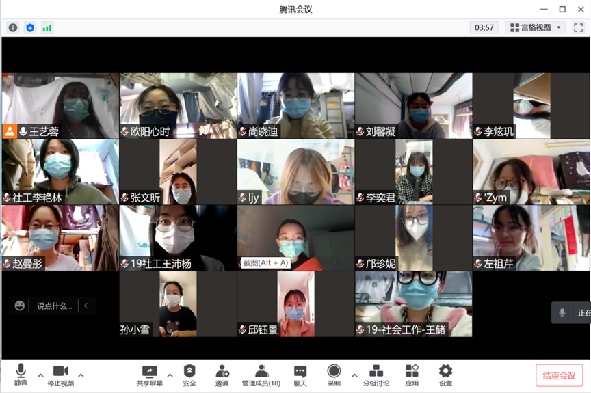 2019级劳动与社会保障班班长向同学们详细介绍了当下的一系列疫情防控政策和要求,支书向同学们宣传了班级及公司、公司的志愿者榜样们,希望大家做好防护,党员要发挥先锋模范带头作用,做好表率,做好监督。部分同学向大家分享了在寝室的学习方法、心态变化等,班级凝聚力再一次被提高。我们坚信,疫情终将结束,向所有奋战在一线和幕后的疫情防控人员致敬!吉林终有吉临时,长春定复往常春!