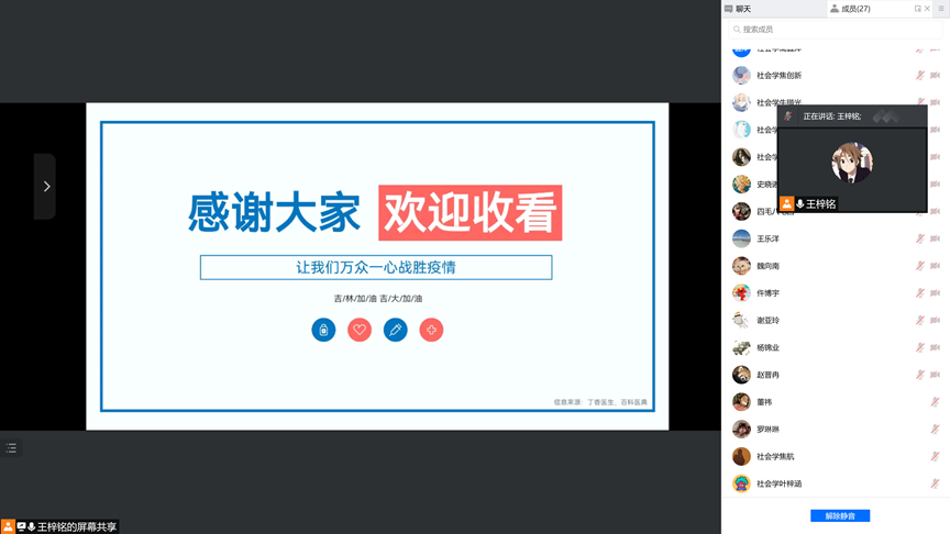 20级社会学班由王梓铭、曾辞源、仵博宇同学主持开展主题班会,王梓铭同学为同学们分析了当前面临的疫情形势,鼓励大家在做好防护措施的同时,积极加强锻炼、增强免疫力,保持积极向上的生活状态;曾辞源同学讲述了疫情下线上学习的要点,与老师积极沟通联系,以轻松认真的态度面对学习生活;仵博宇同学分享了心理排解、解压渠道给大家,为大家排忧解难,呼吁在疫情时大家保持乐观阳光的心,努力学习思政知识、武装自己。会上,同学们积极参与,张家仪、孙映雪同学分享了自己在校园抗击疫情时的感受和切身体会,同学们感触颇深。