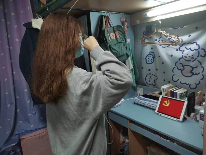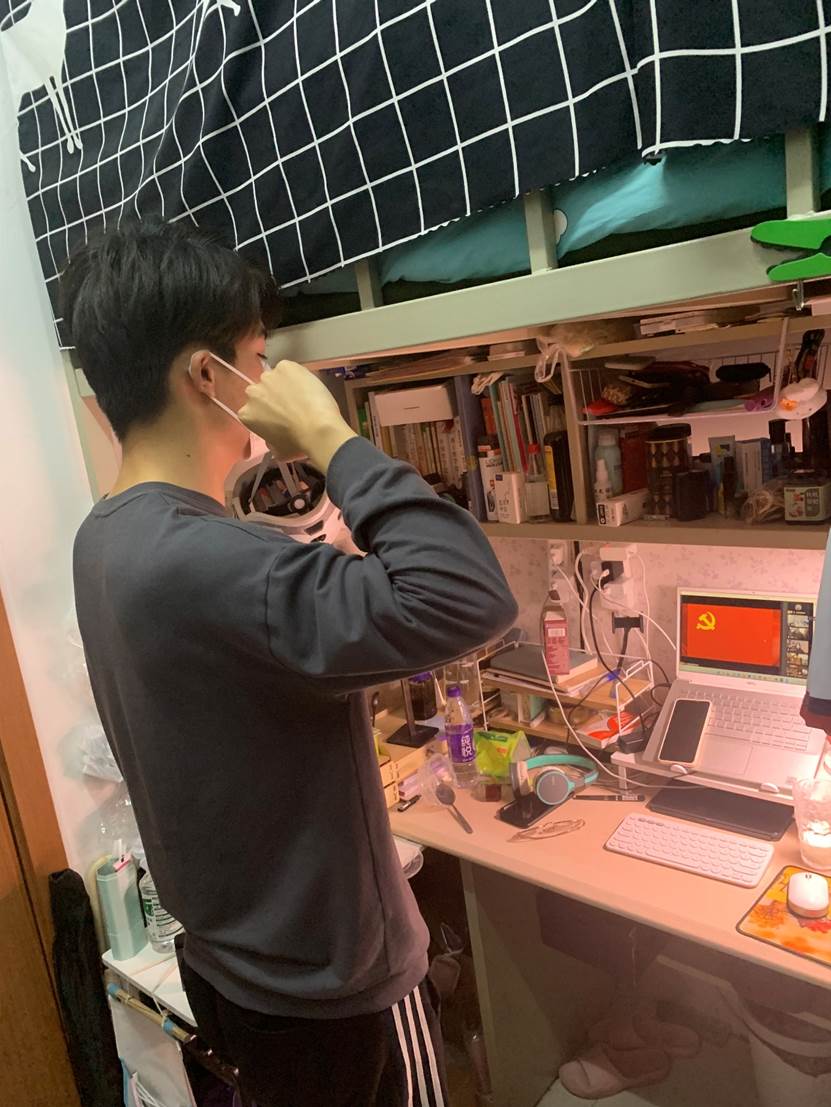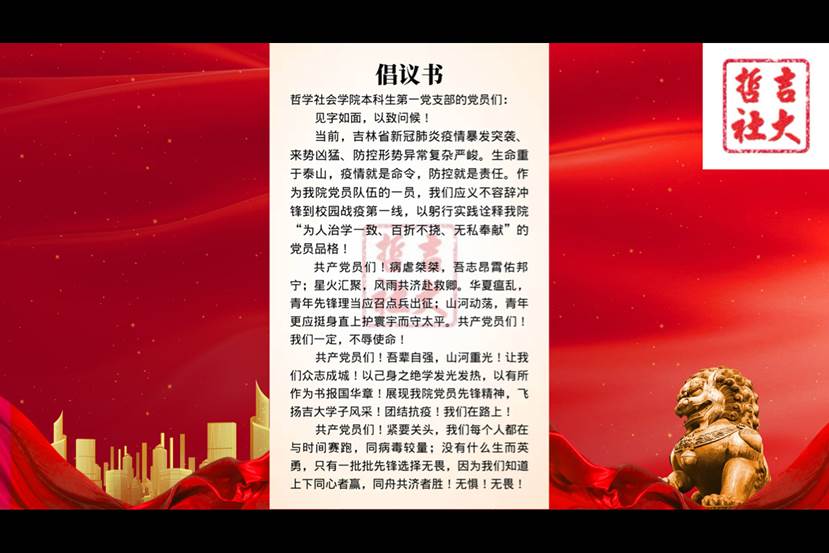 最后一部分主题为“团结抗疫,众志成城”。首先,由19级本科生刘奔腾同志宣读致本科生第一党支部全体党员的倡议书,号召全体党员同志坚定信念,砥砺奋进,积极投身抗击疫情的战斗中去,让青春在祖国和人民最需要的地方绽放。然后,由支部书记刘畅同志进行大会总结发言,刘畅同志高度赞扬了第一党支部党员同志开展的志愿服务活动,叮嘱各位同志一定做好防护,注意安全,用实际行动发挥党员模范带头作用。