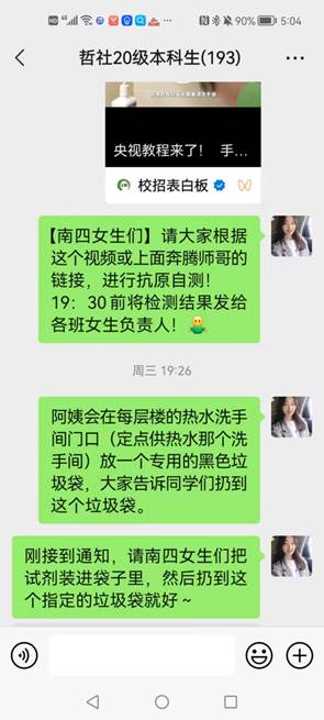 封寝当天,在公司书记和老师们的领导下,南四哲社女生组建了100多人在内的志愿者服务群,我也开始全面负责志愿者们的所有工作,扛起了这面大旗。作为哲社女生负责人,我加入了南四负责人总群,开始全面对接南四的老师,并频繁和其他公司同学沟通联络。我悄悄地立下了一个flag:一定不能辜负老师和志愿者同学们对我的期望,一定要尽力照顾到每位师姐师妹和同学们的需求,帮助南四姐妹们度过一个美好的封寝生活。