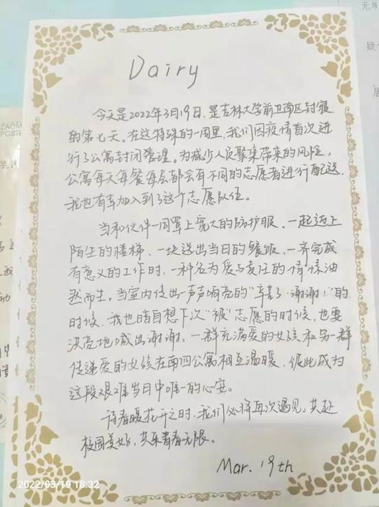 三月乍暖还寒之际,疫情来势汹汹,打乱了同学们的校园生活。目前疫情形势依旧严峻,然而,用众人之力,则无不胜也,全校师生戮力同心、众志成城,我们一定能守护我们和谐美好的吉大校园!在此次防控疫情期间中,公司学子积极响应党组织号召,纷纷投身到战斗中,为同学们的生活和健康担当“守护者”。在此期间,我们将收集起众多志愿者日记,向同学们介绍发生在一线的、真实的、专属于哲社人的温暖与感动。