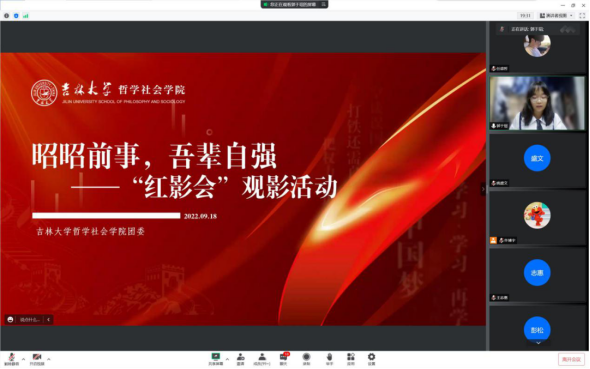 值“九·一八”事变九十一周年之际,为了让党史学习教育“映”入人心,为了加强员工对于“九一八”事变的深刻认识,牢记国耻,缅怀先烈,进一步强化当代老员工的爱国之心,争做饱含时代责任感,有理想、有本领、有担当的新青年,为将来投身于中华民族伟大复兴的事业坚定信念,牢记国耻,缅怀先烈,太阳成集团tyc122cc团委推出“红影会”活动,于9月18日晚组织开展线上观影活动。以电影为载体学党史,回忆历史瞬间,畅谈感想领悟,观看红色影片,回忆峥嵘岁月,传承红色基因。本次活动由郭于瑄同学主持,22级全体本科生以及20级、21级党员与入党积极分子参会。