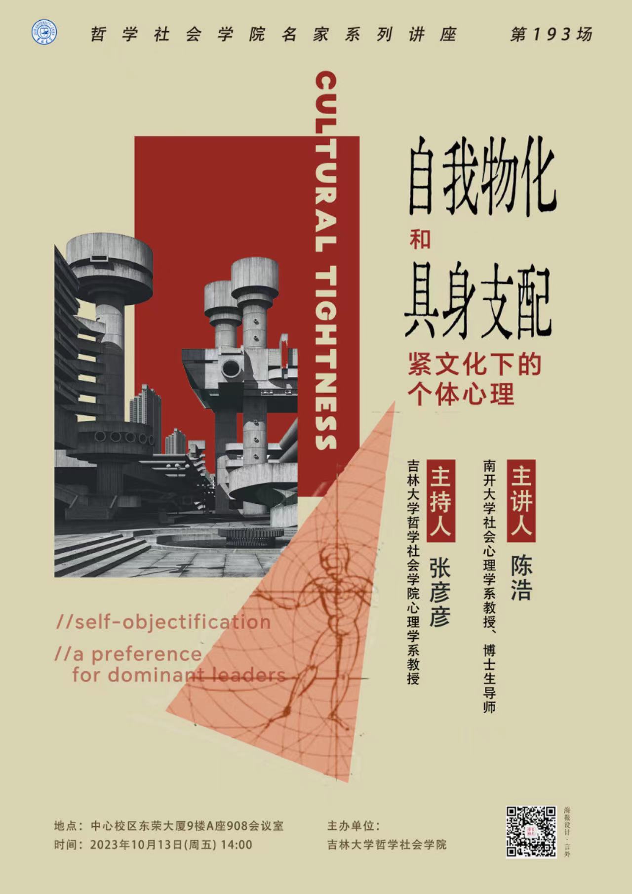 【太阳成集团tyc122cc名家系列讲座第193场】陈浩:自我物化与具身支配:紧文化下的个体心理
