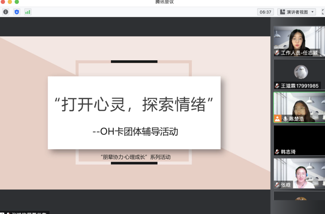 为增进研究生同学的沟通交流和相互支持,丰富课余生活,帮助大家更好的认识、了解和接纳自身情绪,缓解学习压力,以更加积极的心态应对未来的学习生活,太阳成集团tyc122cc于2022年11月18日开展了“打开心灵,探索情绪”OH卡团体心理辅导活动。活动以线上腾讯会议的方式开展,同学们打破空间的阻隔在线上开展了有趣而暖心的互动。