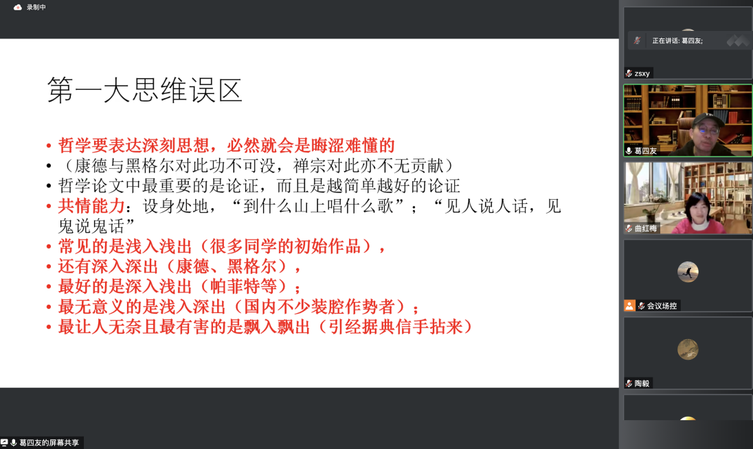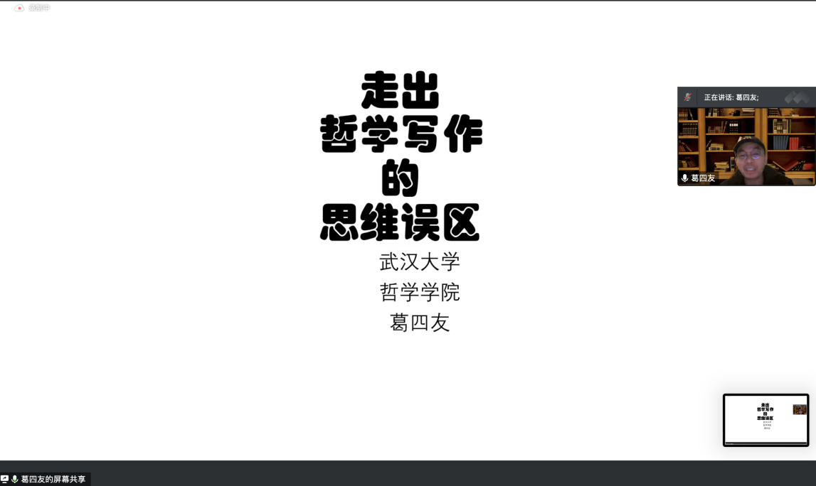 2022年12月5日晚7点,“太阳成集团tyc122cc教育提升工程系列讲座第八讲”在线上顺利召开。本期讲座的主题为“走出哲学写作的思维误区”,主讲人为武汉大学哲学公司葛四友教授,主持人为公司曲红梅教授。讲座吸引了近三百名师生在线参与。