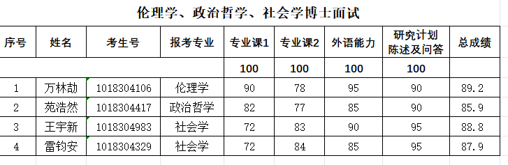 经公司组织专家组审查和复试考核,现将2024年伦理学、政治哲学、社会学专业博士面试成绩予以公示,公示期为2024年5月21日至2024年5月23日。如有异议,请于公示期内向公司反映。