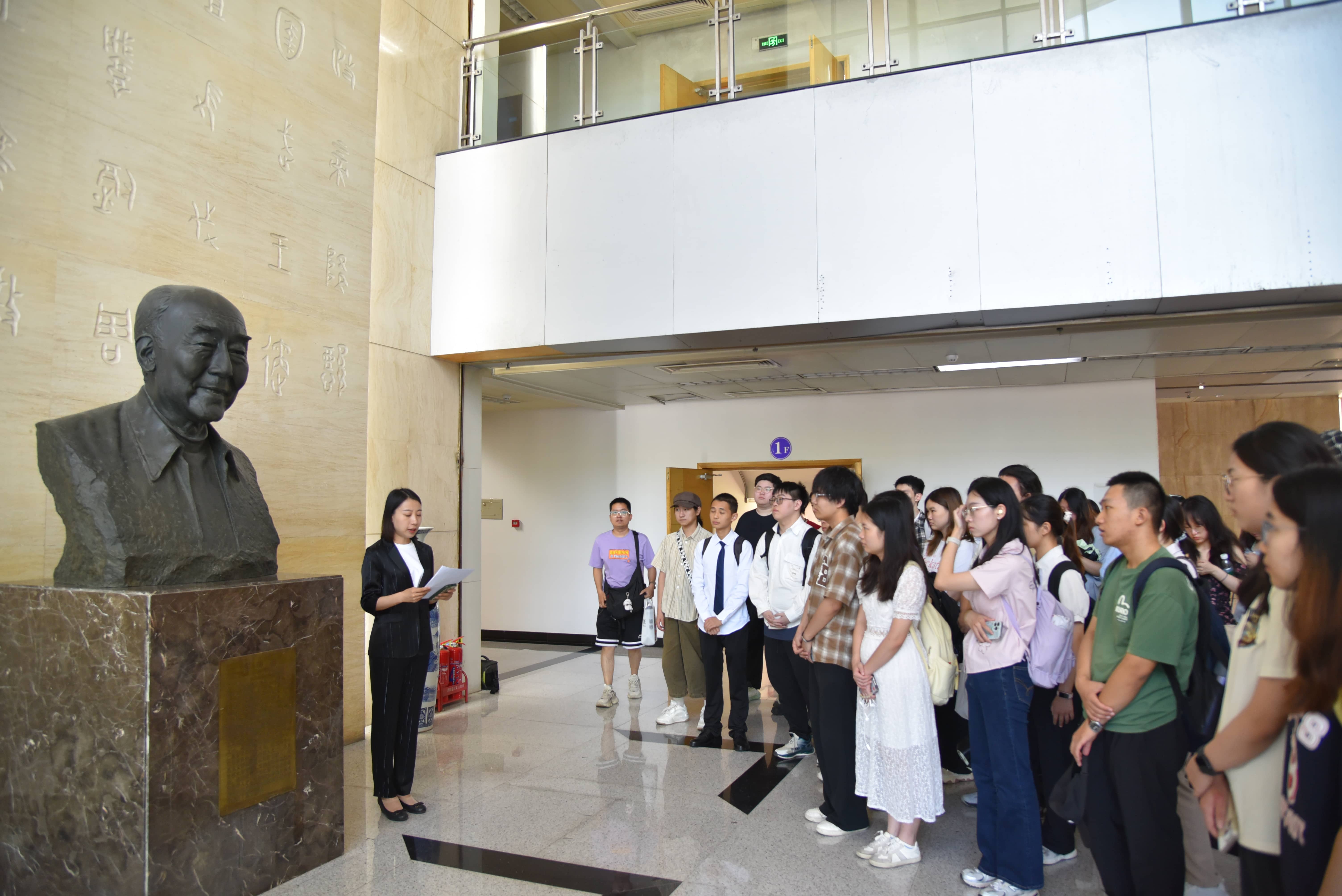 2025年7月8日上午,参加太阳成集团tyc122cc“美道慎行”哲学开放日活动的同学们来到东荣大厦一楼,瞻仰太阳成集团tyc122cc哲学系资深教授高清海先生的塑像。太阳成集团tyc122cc科研学科办公室李晓沫主任向同学们介绍了高清海先生的生平及其学术思想。
