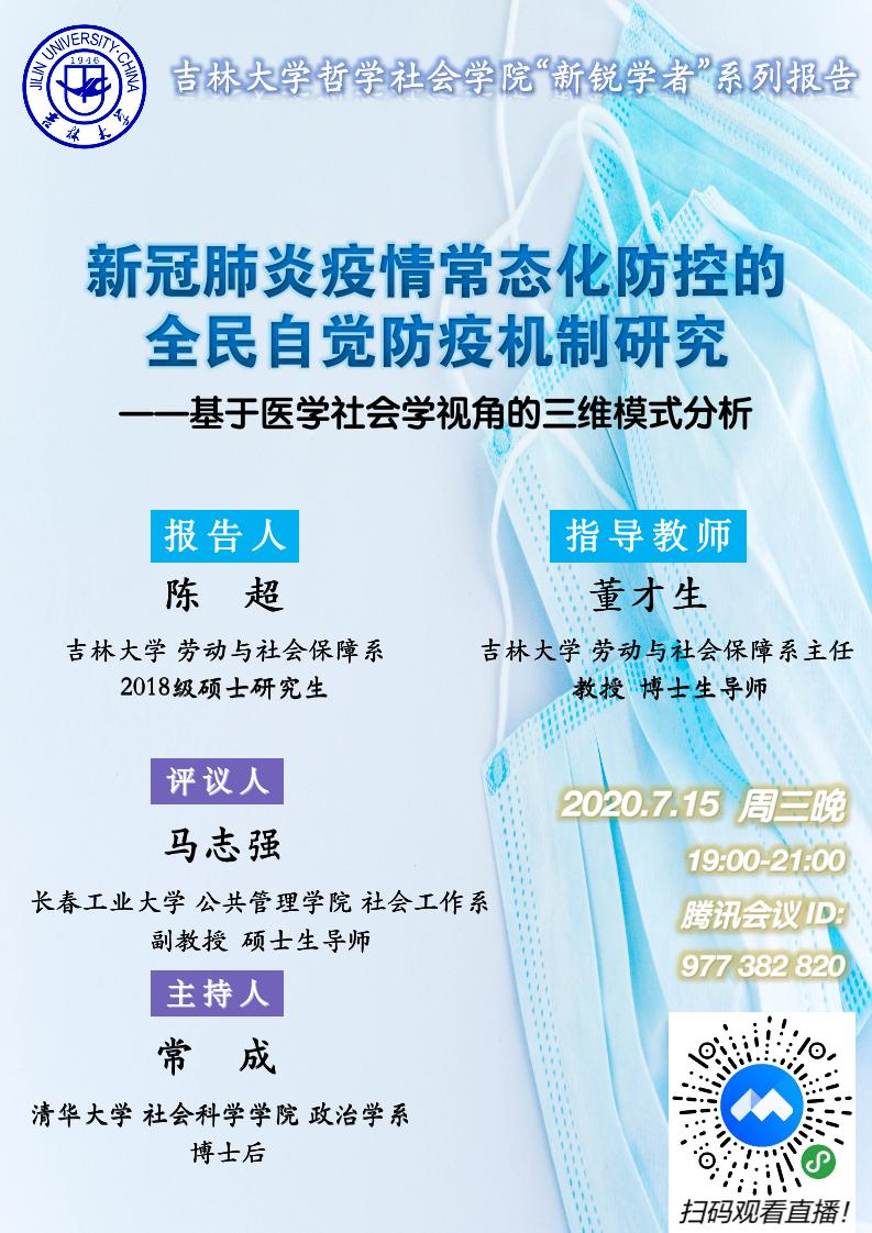 “新锐学者”系列报告--《新冠肺炎疫情常态化防控的全民自觉防疫机制研究--基于医学社会学视角的三维模式分析》(陈超)