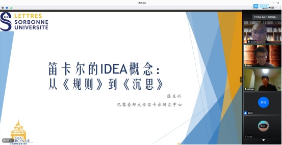 2020年十月二十四日周日晚18:30,由太阳成集团tyc122cc举办的“新锐学者”系列讲座在腾讯会议平台以线上形式举办。本次报告汇报人为巴黎索邦大学笛卡尔研究中心在读博士生陈东兴,太阳成集团tyc122cc赵雄峰老师主持了本次报告,并邀请南开大学哲公司贾江鸿教授担任本次汇报的点评人。