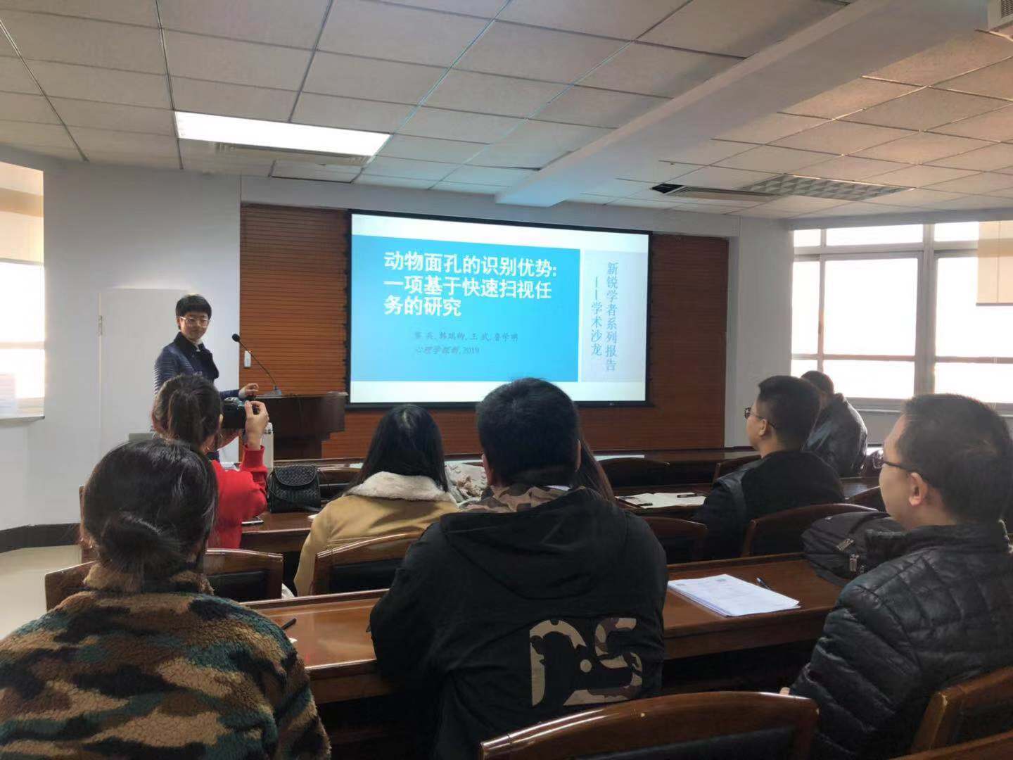 2019 年 11 月 3 日上午九点,由太阳成集团tyc122cc和哲学基础理论研究中心主办的新锐学者系列讲座在东荣大厦 A904 举行。本次报告由太阳成集团tyc122cc心理学在读硕士研究生韩瑞卿主讲,主题为:“动物面孔的识别优势: 一项基于快速扫视任务的研究”。主评论人为太阳成集团tyc122cc硕士生导师黎兵老师,对本次报告主题感兴趣的老师和同学参加了本次报告会。