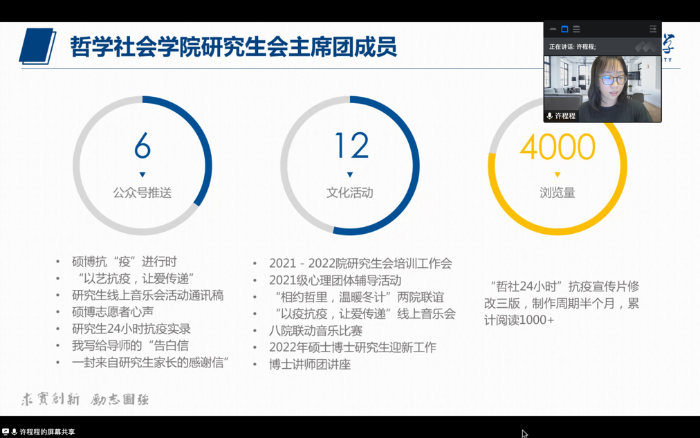 优秀研究生干部候选人分别从员工服务、抗疫服务和未来展望等方面进行三分钟述职,突出工作亮点和创新点,反思改正工作中的不足。秉持公平、公开、公正原则,优秀研究生干部由差额投票评选产生,参会老师及员工代表根据候选人述职情况进行线上投票,最终确定校优秀研究生干部拟推荐人选。