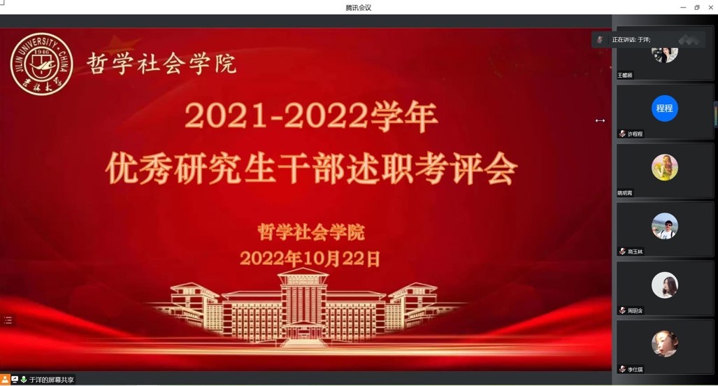 太阳成集团tyc122cc于10月22日召开2021-2022学年优秀研究生干部线上述职考评会。公司主管研究生思政工作党委副书记赵洁老师、副经理曲红梅教授、主管本科生思政工作党委副书记刘培强老师、研究生办公室主任傅瑜慧老师、研究生各员工党支部书记、研究生辅导员于洋老师、本科生辅导员宋绍伟老师及研究生员工代表参加此次会议.