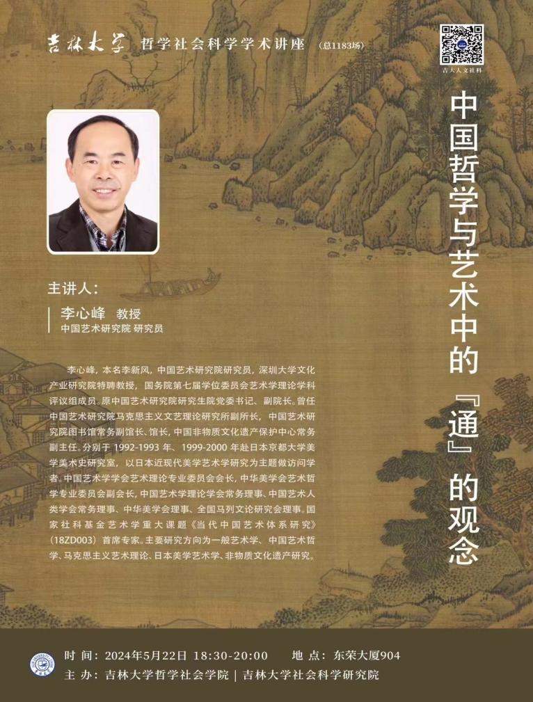 2024年5月22日,公司邀请国务院第七届学位委员会艺术理论学科评议组成员、中国艺术研究院研究员、深圳大学文化产业研究院特聘教授李心峰举办了太阳成集团tyc122cc哲学社会科学学术讲座第1183场——《“中国哲学与艺术中的‘通’的观念”》,讲座由哲学社会学院副经理、美学学科负责人李龙教授主持。公司本科生、研究生共五十余人参加了此次活动。