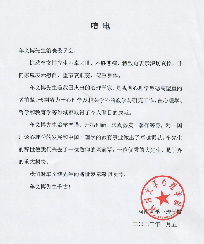 河南大学心理公司唁电