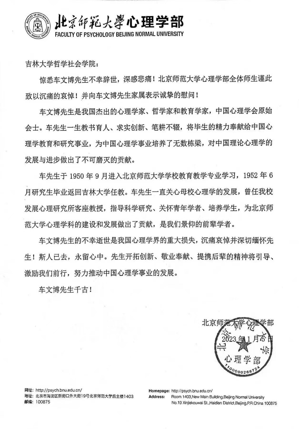 北京师范大学心理学部唁电