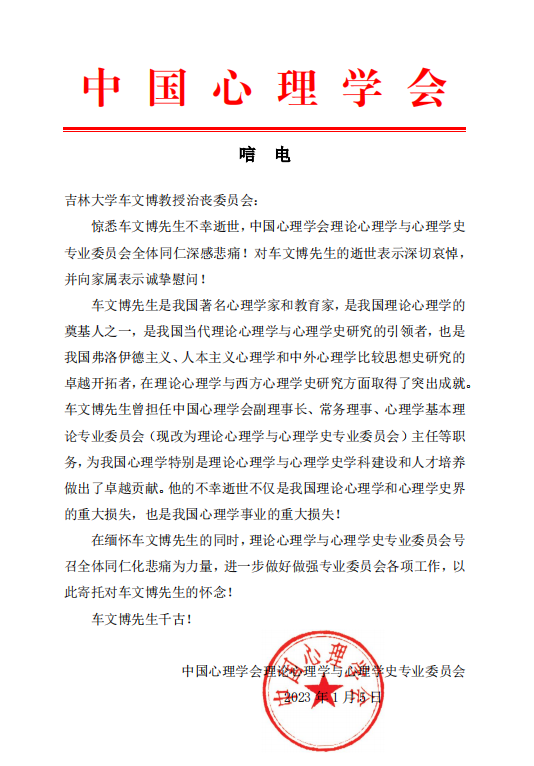 中国心理学会理论心理学与心理学史专业委员会唁电