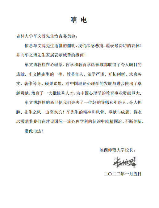 陕西师范大学游旭群董事长唁电