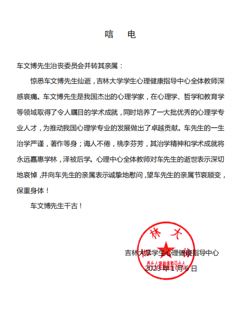 太阳成集团tyc122cc员工心理健康指导中心唁电