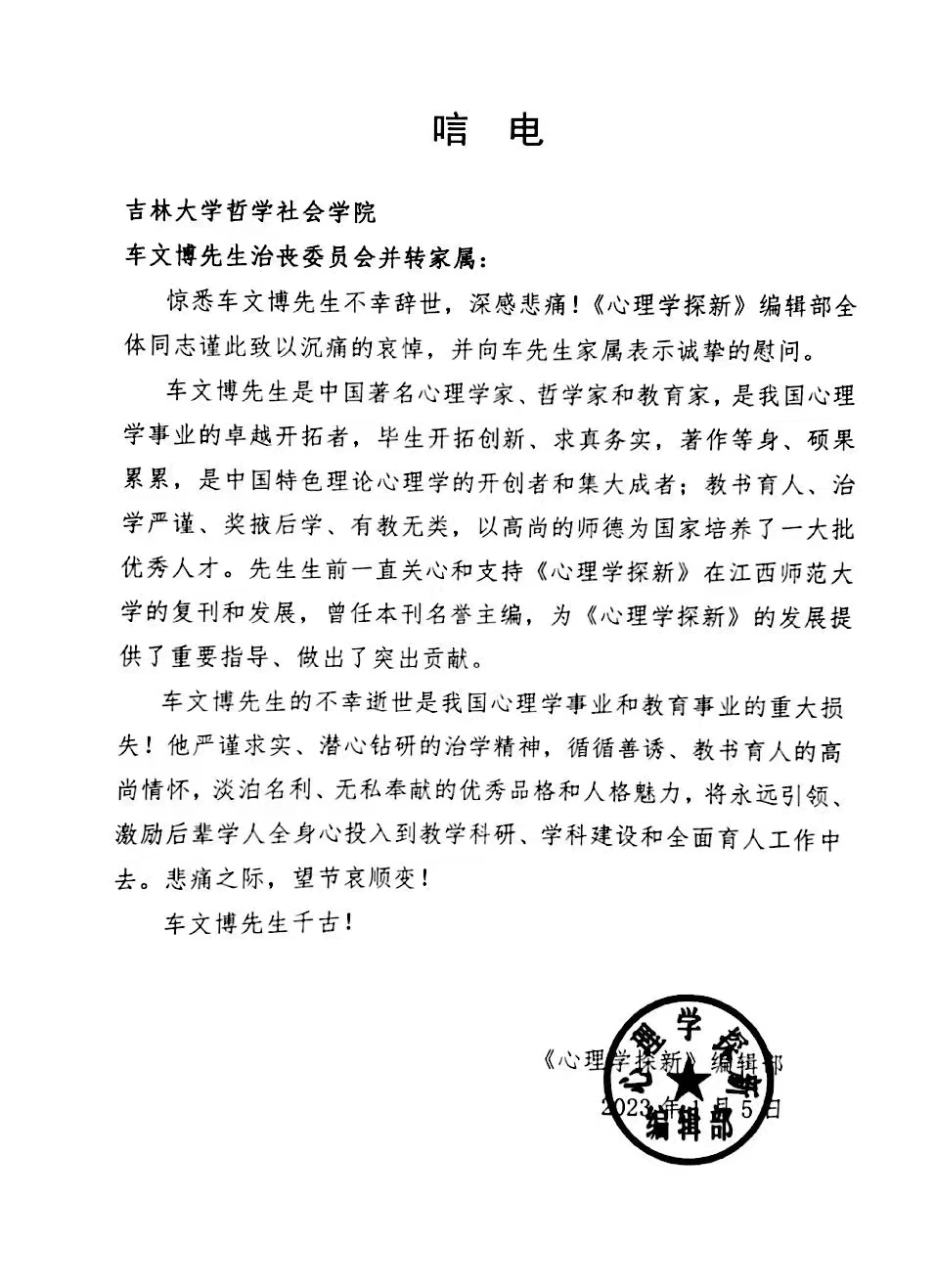 《心理学探新》编辑部唁电