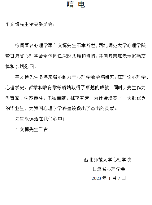 西北师范大学心理公司甘肃省心理学会唁电